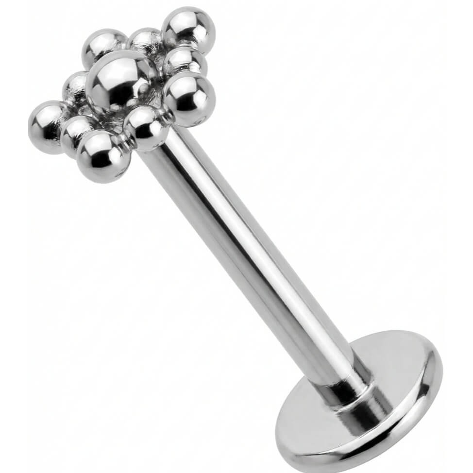 Upgrade your ear game with this stunning beaded cluster. The geometric design features a central sphere surrounded by smaller beads, creating a chic diamond shape that adds texture to any stack. Made from high-quality Titanium, it is skin-friendly and durable. Perfect for styling your helix, tragus, or lobe look!