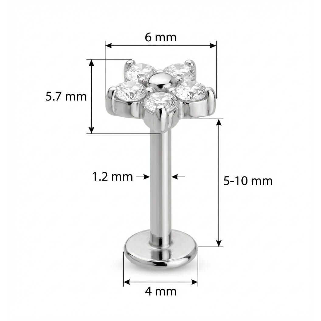 Let your style bloom with this stunning floral design. Featuring six sparkling clear crystals surrounding a polished center, this piece catches the light beautifully. Crafted from high-quality Titanium, it is hypoallergenic and durable, making it perfect for everyday wear. Ideal for upgrading your helix, tragus, or lobe curation with a touch of nature-inspired glam.