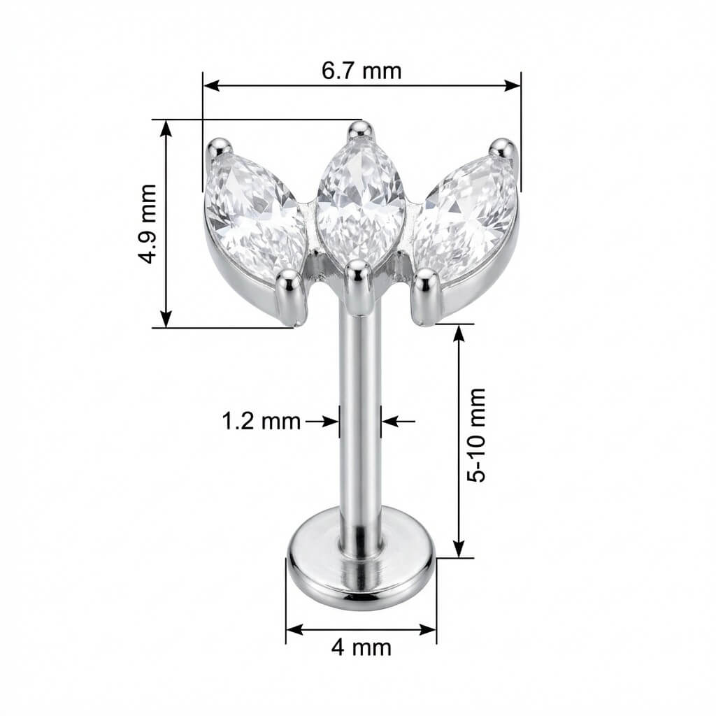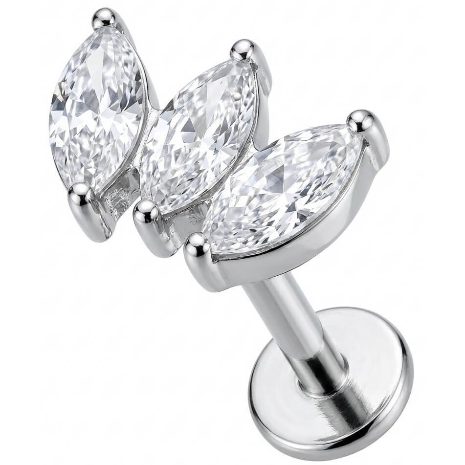 Upgrade your ear game with this stunning cluster design. Featuring three sparkling marquise-cut crystals arranged in a delicate fan shape, it creates the perfect arc for your helix, conch, or lobe setup. Made from high-quality Titanium, this piece is hypoallergenic, durable, and ready for everyday wear. Add some serious sparkle to your stack!
