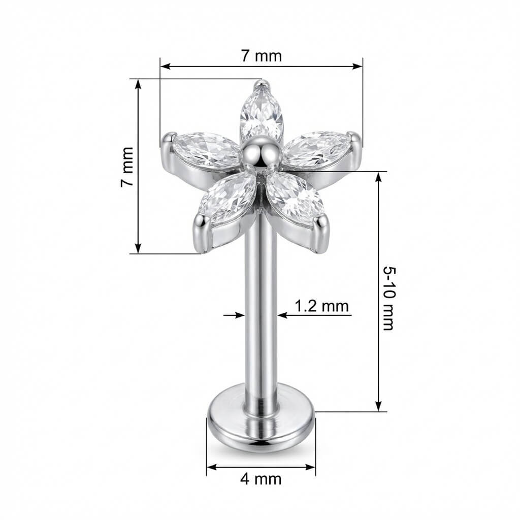 Time to let your ear party bloom! This stunning design features six marquise-cut crystals arranged in a perfect floral shape, centered with a polished bead. It captures the light from every angle, giving you that ultimate sparkle. Crafted from high-quality Titanium, this piece is hypoallergenic and durable enough for everyday wear. Whether you rock it in your helix, tragus, or lobe, it’s the fresh, floral upgrade your collection needs.