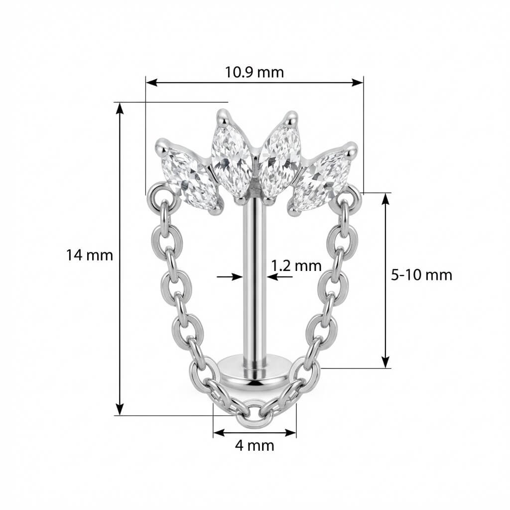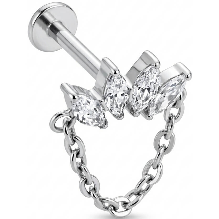 Level up your ear stack with this absolute showstopper. Featuring a curved fan of four sparkling marquise-cut stones connected by a delicate draping chain, this piece adds movement and shine to any look. Made from high-quality Titanium, it is skin-friendly and durable enough for everyday wear. Whether in your helix or lobe, this design is the ultimate upgrade for your jewelry collection.
