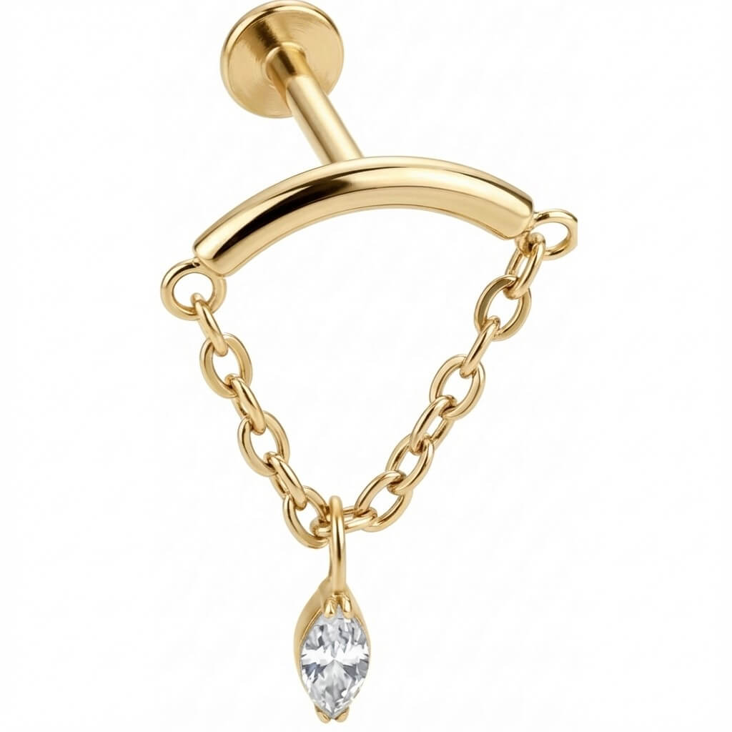 Elevate your ear game with this stunning piece that adds movement and sparkle to your stack. The design features a gently curved bar that hugs your anatomy, connected by a delicate draped chain holding a shimmering marquise-cut crystal. Crafted from high-quality Titanium, this piece is as skin-friendly as it is eye-catching. It's the perfect statement for a helix or conch placement, catching the light with every turn of your head.