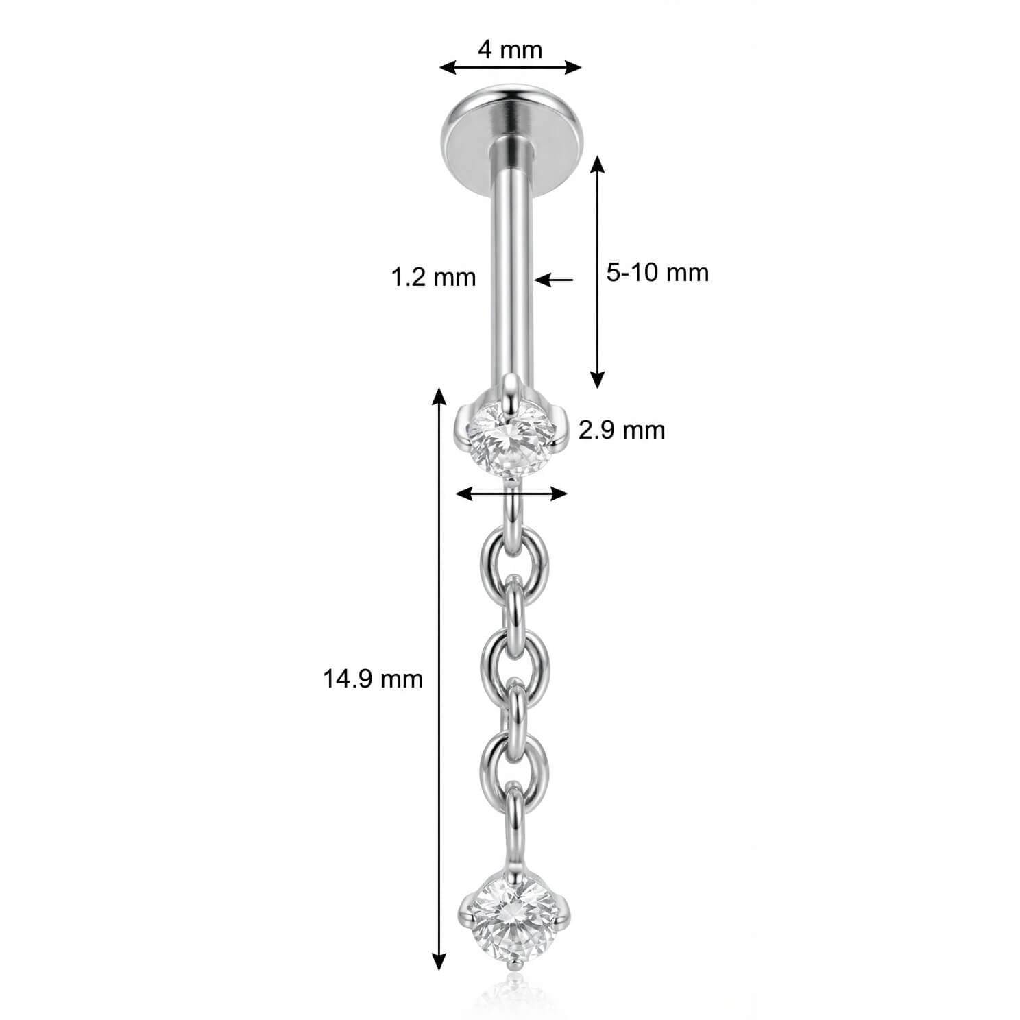 Add some serious sparkle and movement to your ear stack with this stunner. Featuring a brilliant prong-set crystal at the top, it connects to a delicate chain that drops into a second, shimmering gem. Crafted from high-quality Titanium, this piece is hypoallergenic and perfect for everyday wear. It’s the ultimate upgrade for your helix or lobe setup.