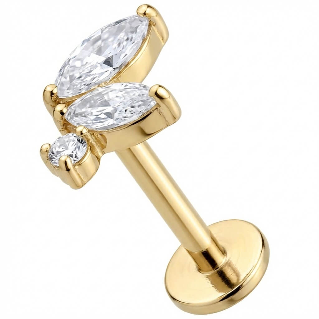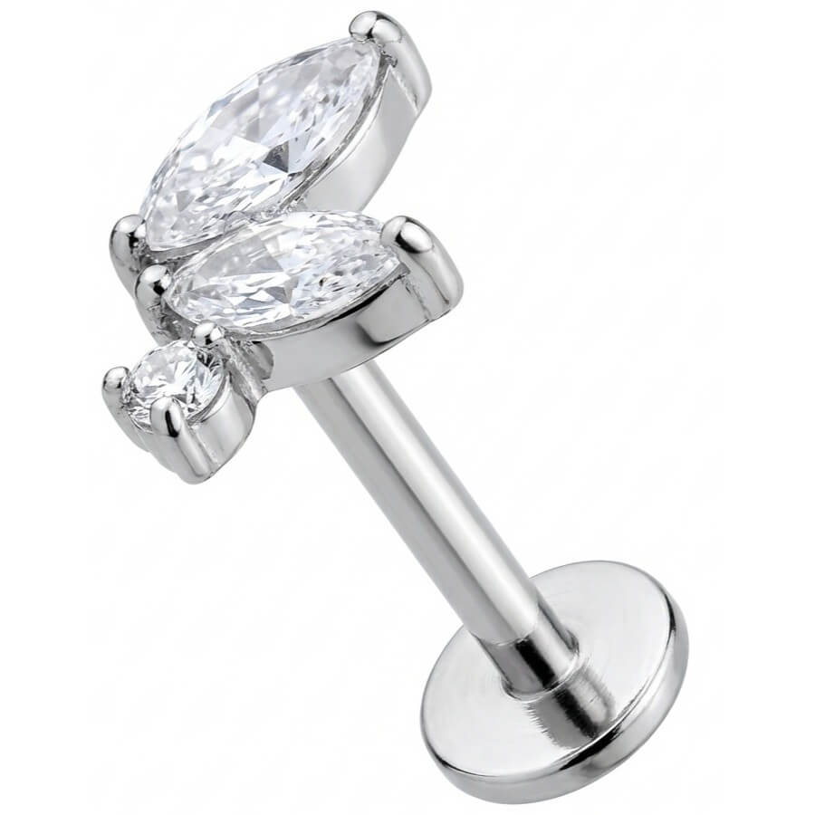 Level up your ear stack with this dreamy crystal cluster. Featuring two marquise-cut stones and a tiny round accent, it creates a delicate leaf motif that sparkles from every angle. Crafted from premium Titanium, it is hypoallergenic and ready for everyday wear. A must-have addition for your helix, conch, or lobe setup.